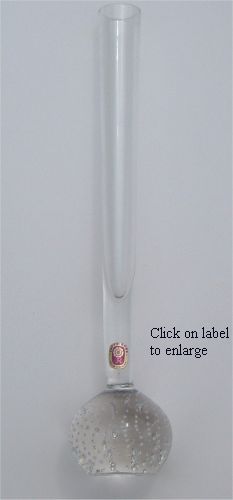 The vase is approximately 260 mm (10 2/10ths inches) tall. The base is round and has small evenly spaced bubbles that come up from the bottom in a slight spiral. It has a slightly concave bottom. The stem has a narrow flare being approximately 23mm (15/16ths of an inch) in diameter.
