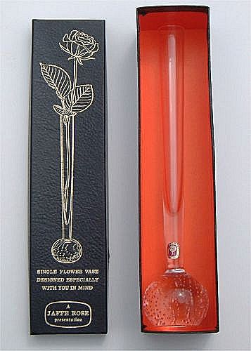 I believe this vase was made in Czechoslovakia. It still has the original box and label. The box is made from cardboard, black with a leather look finish and a gold embossed design and lettering on the lid. The interior is bright orange.