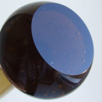 This dark amber based vase is approximately 239mm (9 4/10ths") tall. The base is a round ball shape, with medium sized random bubbles,
