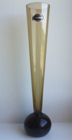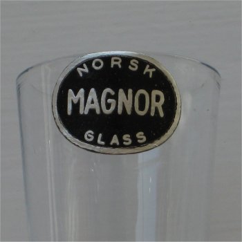 The label is an oval shape, with a black background and a silver border and lettering stating "MAGNOR GLASS NORWAY"