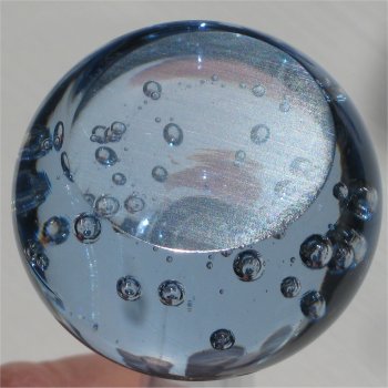 This pale blue based vase is approximately 140mm (5 1/2") tall. The base is a ball shape but has slightly sloping shoulders,